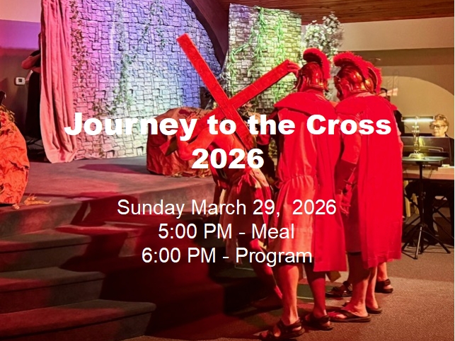 "Journey to the Cross" is a powerful musical drama that takes you through the story of redemption - from Creation to the Resurrection of Jesus." Come join us at 5:00pm for a meal and fellowship. The presentation begins at 6:00pm. Bring your whole family, you won't be disappointed.